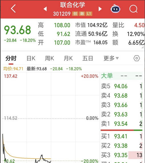 继10月15日大跌9.03%后,联合化学今天的股价再次低开于107元,开盘后的股价直线跳水,不久后就触及20%跌停价91.62元,随后的股价稍有回升,截止早盘休市,收于93.68元,跌幅仍达18.20%。