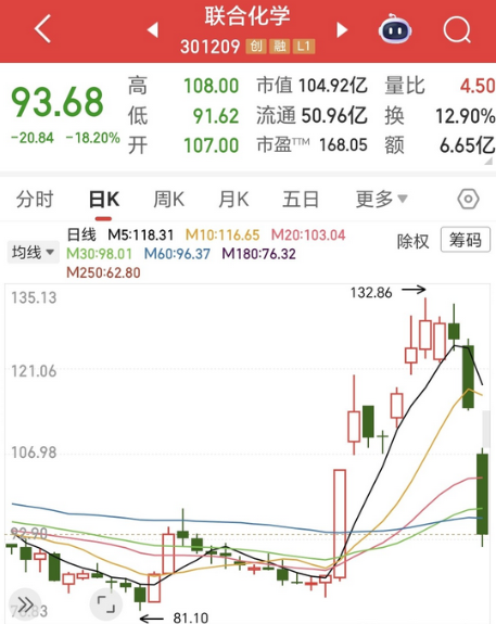 至此,联合化学在10月10日创下该股上市以来的历史新高132.86元后,5个交易日内股价的最大区间跌幅已达31%左右。