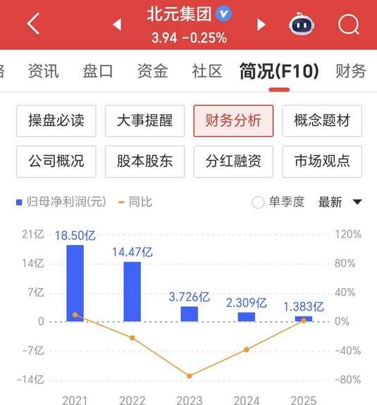 先来看公司基本面,北元集团的年营收从2021年的最高131.5亿元逐年下降到2024年的100.8亿元,而业绩的掉幅更是令人惊讶,从2021年的18.5亿元净利润断崖式掉到2.31亿元,降幅多达87.5%,也就是说公司目前百亿营收仅能实现2.31亿元的利润,销售净利润率约为2.3%左右。