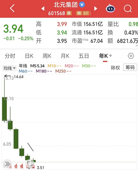 如今又是一个月过去了,北元集团的股价回落至3.94元,按此价格来算其亏损已增至37.5万左右,离回本之路又远了一步。