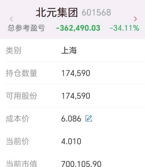 随着北元集团股价的一路下跌,其也随之一路增资补仓,随着仓位的越来越重,亏损幅度也一路扩大,就在不久前的9月15日当天其还斥资8万元,以4.00元的价格补仓2万股,当天,其在该股的总持仓已达174590股,持仓平均成本6.08元,累计在该股投入本金106万元,当时亏钱36万元,亏损幅度达34.11%。