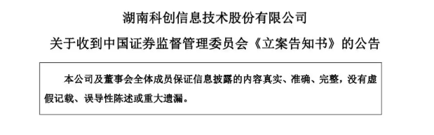 晚间,上市公司科创信息发布公告称,公司于当日收到中国证监会下发的《立案告知书》,因公司涉嫌信息披露违法违规,中国证监会决定对公司立案。