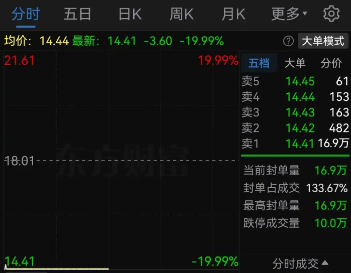 果不其然,今天科创信息开盘直接20厘米一字跌停,虽然开板后有资金撬板,但仅一分钟又被再次砸至跌停封死,截至今天上午收盘,科创信息股价报收于14.41元,跌停板上仍有封单16.9万手,有超过2.43亿资金在排队出逃,今天上午成交了1.83亿元,换手率6.54%,目前公司总市值34.75亿元。