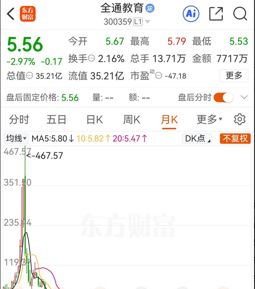 这场下跌似乎永无尽头。截至2025年11月21日,全通教育股价仅为5.56元,总市值35.21亿元。与十年前467.57元的高点相比,跌幅高达98.8%。