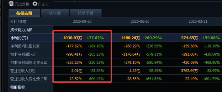 三季报显示,公司营收同比下降了23.52%,净利润更是亏损了1030万,同比下滑了177.62%;扣非净利润也亏损了990万,更是同比大幅下滑了265%!