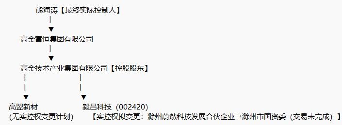 熊海涛是通过高金富恒集团控股高金技术产业集团,再由高金技术产业集团作为直接控股股东,分别持有高盟新材、毅昌科技核心股权,实现对两家上市公司的实际控制。其股权控制图如下: