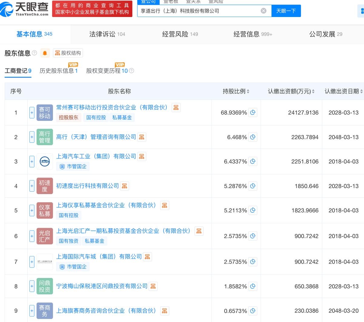 天眼查App信息显示,享道出行成立于2018年4月,前称为上海赛可出行科技服务有限公司。目前,该公司的注册资本为3.5亿元,法定代表人为吴冰,主要股东包括上汽总公司、常州赛可等。