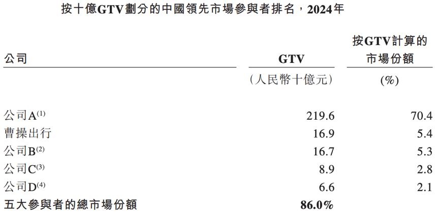 2024年,曹操出行的总交易价值(GTV)约为人民币170亿元,较2023年增加38.8%。就中国网约车平台而言,滴滴出行2024年的GTV约为2196亿元,第二、第三、第四和第五分别为曹操出行、T3出行、首汽约车、享道出行。
