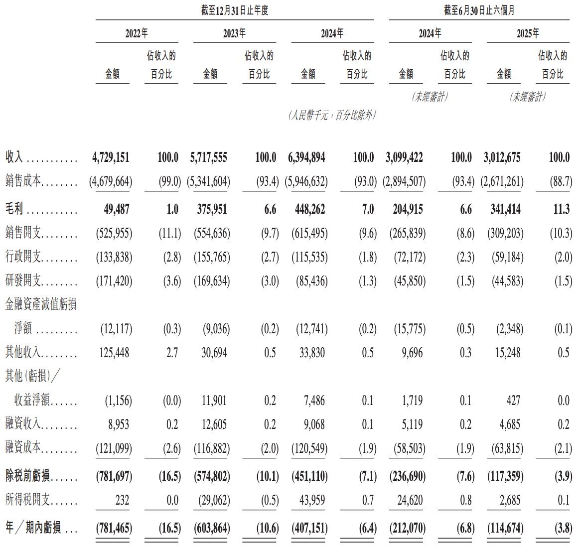 尽管尚未实现盈利,但享道出行的亏损金额和亏损率在持续收窄。其中,2022年、2023年、2024年度和2025年上半年的亏损率分别约为16.5%、10.6%、6.4%和3.8%。与之对应的是,该公司的毛利率分别为1.0%、6.6%、7.0%和11.3%,持续优化。