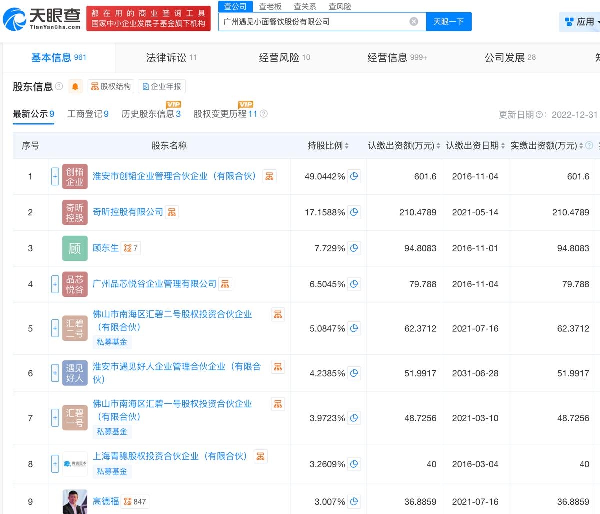 天眼查App信息显示,遇见小面成立于2014年2月,前身为广州市饺工匠餐饮有限公司。目前,该公司的注册资本为1226.6496万元,法定代表人为宋奇,主要股东包括淮安市创韬企业管理合伙企业(有限合伙)、奇昕控股有限公司等。