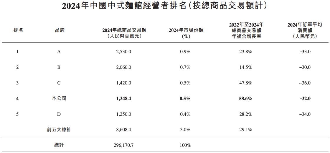 根据弗若斯特沙利文的资料,于2024年按总商品交易额计,遇见小面为第四大中式面馆经营者,市场份额为0.5%。按2024年总商品交易额计,该公司于整体中式快餐餐厅市场排名第十三,市场份额为0.14%。