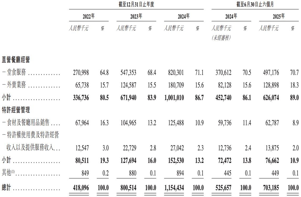 就直营餐厅经营而言,堂食服务为基本盘,分别贡献收入约2.71亿元、5.47亿元、8.20亿元和4.97亿元,占总收入的比例分别为64.8%、68.4%、71.1%和70.7%,其中2023年、2024年分别同比增长102.0%、49.9%,2025年上半年同比增长33.8%。