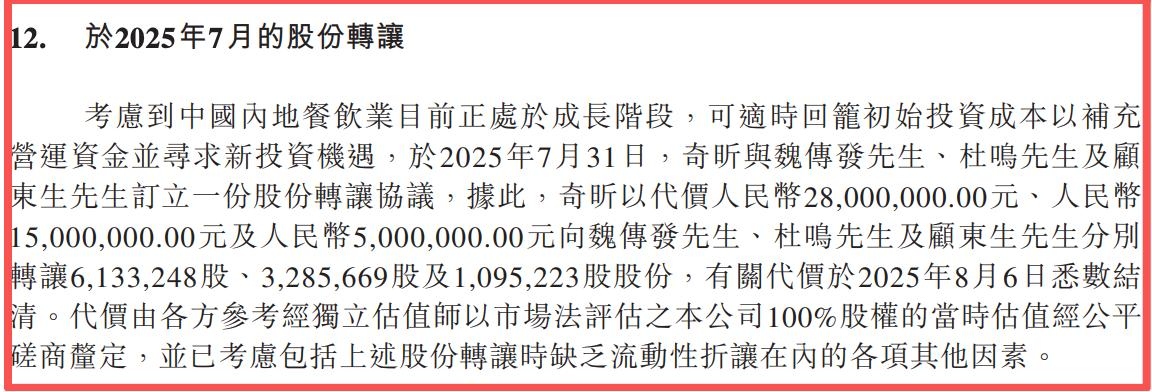 遇见小面招股书显示,奇昕于2025年7月和魏传发、杜鸣、顾东生签订股权转让协议,向魏传发、杜鸣、顾东生转让遇见小面的股权,分别作价2800万元、1500万元和500万元,每股成本为4.5653元。