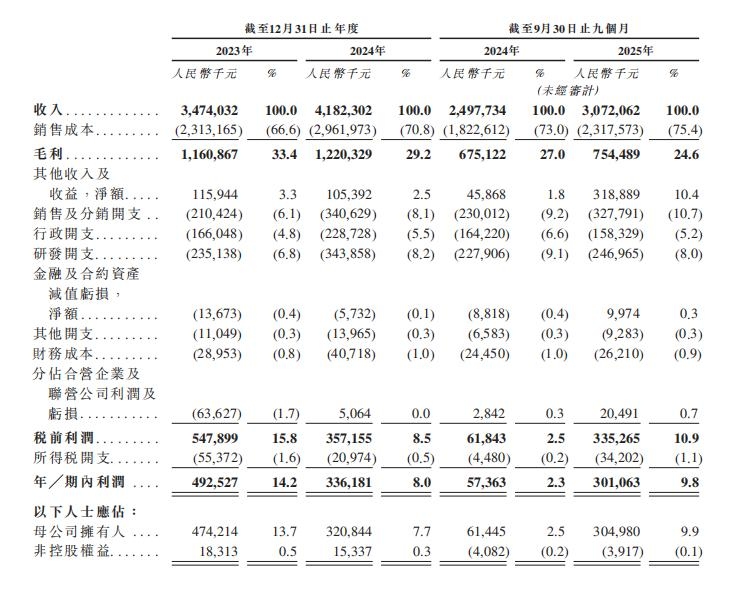 不过,期内利润则由2023年的约4.93亿元降至2024年的约3.36亿元,年内利润率亦由14.2%降至8.0%;截至2024年9月30日止9个月期内利润为约0.574亿元,期内利润率为2.3%,截至2025年9月30日止9个月期内利润回升至约3.01亿元,期内利润率回升至9.8%。