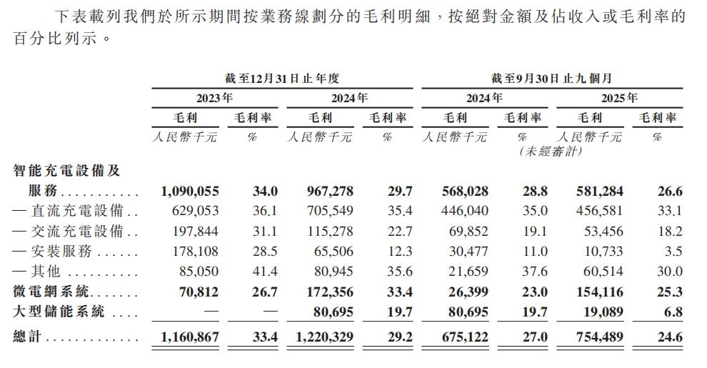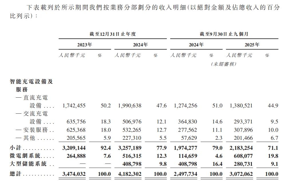 更关键的一点在于收入构成与毛利率的同步变化。其招股书显示,按业务分部划分,智能充电设备及服务收入如前所述,占比在2023年、2024年、截至2024年9月30日止9个月、截至2025年9月30日止9个月分别为92.4%、77.9%、79.0%、71.1%;微电网系统收入占比分别为7.6%、12.3%、4.6%、19.8%;大型储能系统收入占比在2024年、截至2024年9月30日止9个月、截至2025年9月30日止9个月分别为9.8%、16.4%、9.1%。