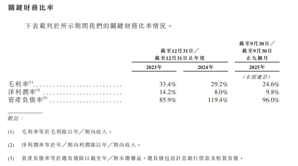 招股书显示,其资产负债率从85.9%升至119.4%,随后回落至96.0%。需要注意的是,此处的比率,实为“负债权益比”(即总负债除以总权益),而非常用的“总负债除以总资产”。因此,这一比率的升降,直接反映的是其负债相对于股东权益的规模变化,在资产结构大体稳定的情况下,该比率对杠杆变化更敏感。
