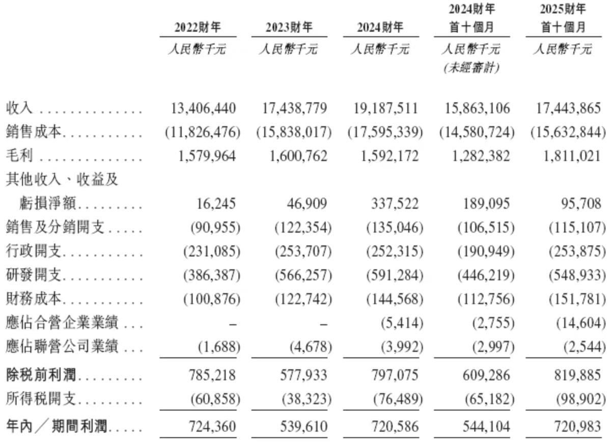 业绩方面,2022年、2023年、2024年度和2025年前10个月,国恩科技的收入分别分别约为134.06亿元、174.39亿元、191.88亿元和174.44亿元,净利润分别约为7.24亿元、5.4亿元、7.21亿元和7.21亿元。