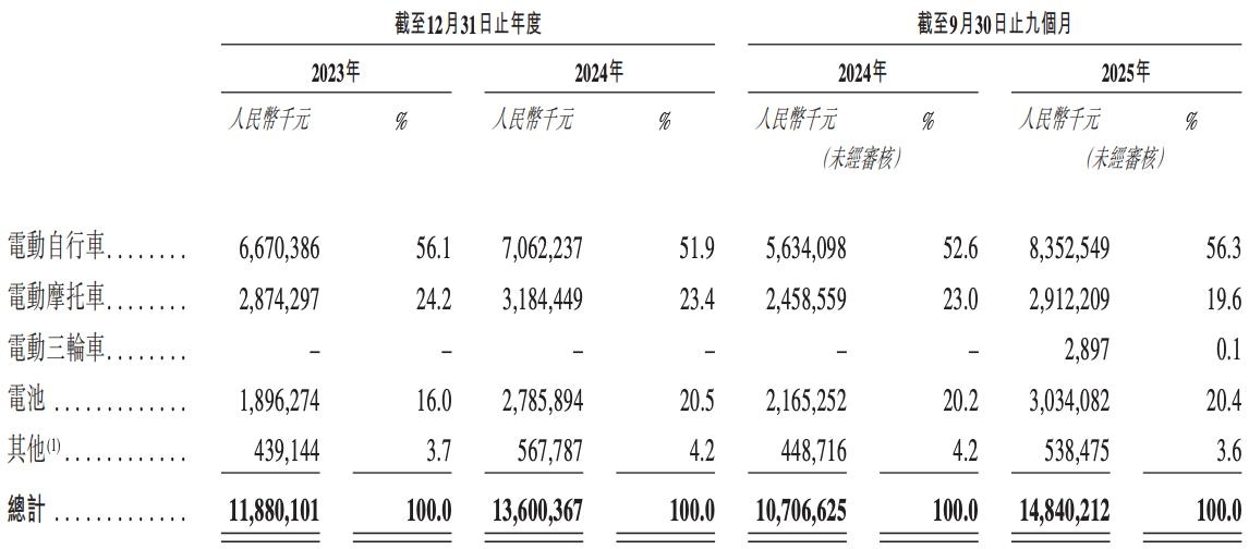 过去数年,销售电池也成为了台铃科技新的增长点。2023年、2024年度,台铃科技的电池收入分别约为18.96亿元、27.86亿元,占比分别为16.0%、20.5%。2025年前三季度,该公司的电池收入进一步增长至30.34亿元,占比维持在20.4%。