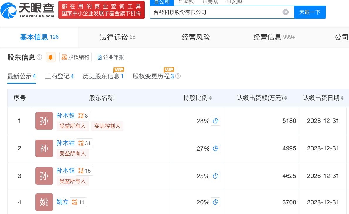 天眼查App信息显示,台铃科技成立于2018年12月,前身为台铃科技发展有限公司,位于无锡市。目前,该公司的注册资本约为2.15亿元,法定代表人为孙木钳,主要股东包括孙木楚、孙木楚、孙木钗、姚立等。