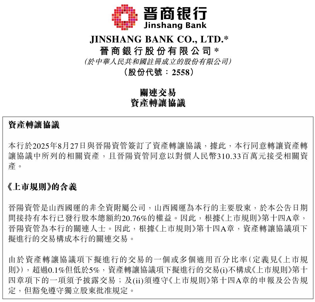 作为山西省唯一的省级法人城市商业银行,近日,晋商银行股份有限公司(HK:02558,下称“晋商银行”)$晋商银行(02558)$ 发布公告称,所有先决条件获达成后,其资产转让协议的交割已于2026年2月11日达成。