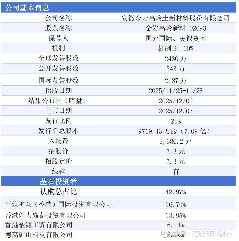 总结:金岩高岭新材从国内新三板转港股让市,是资源类行业的细分市场龙头。而近期资源板块表现强劲,如佳鑫国际,紫金黄金国际和创新实业升幅都十分不错。香港市场一直对资源类股票有比较高的兴趣而且金岩高岭新材这次发行规模不大。公开部分只243万股1773.9万元,货量十分稀少只比隔壁量化派多几百万货。而且基石投资者中不乏国企身影,国企一贯以稳健著称,从不轻易乱动。机制B 10%不败的神话大概率延续,全力申购是必然。至于要不要暗盘买入,由于操作难度大。建议投资者要结合自己资金量及风险承受能力,制定合理的投资策略和风险控制措施。