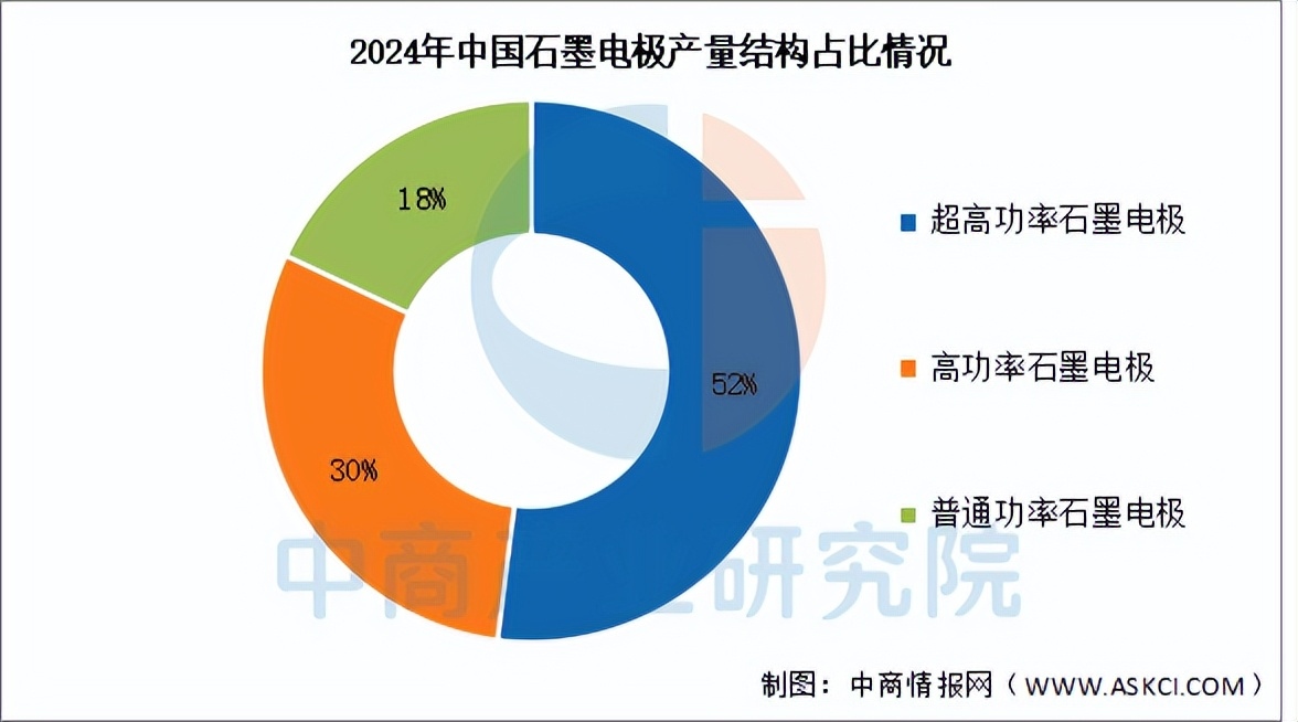 2024年中国石墨电极产量达到88.1万吨,较去年同比增0.97%,其中超高功率石墨电极占比52%,高功率石墨电极占比30%,普通功率石墨电极占比18%。
