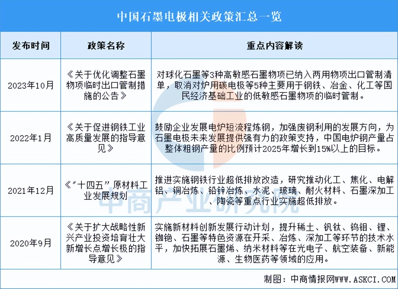 石墨电极是关系国民经济和社会发展的重要产业,近年来国家出台了《关于优化调整石墨物项临时出口管制措施的公告》《关于促进钢铁工业高质量发展的指导意见》《“十四五”原材料工业发展规划》等产业政策,从产学研合作、知识产权保护等方面给予政策支持,为石墨电极行业创造了良好的政策环境。