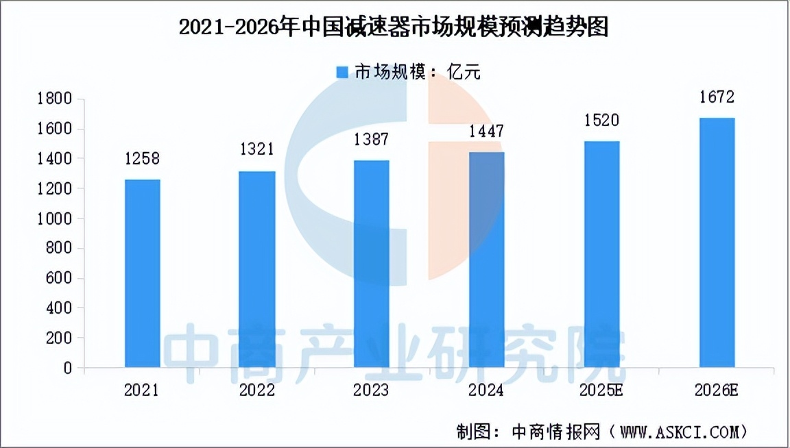减速器是实现精密运动的核心部件,成本约占整机30%-35%。中商产业研究院发布的《2025-2030年中国减速器市场前景及融资战略咨询报告》显示,2024年中国减速器行业市场规模约1447亿元,较上年增长4.3%。中商产业研究院分析师预测,2025年中国减速器市场规模将增长至1520亿元,2026年市场规模将达到1672亿元。