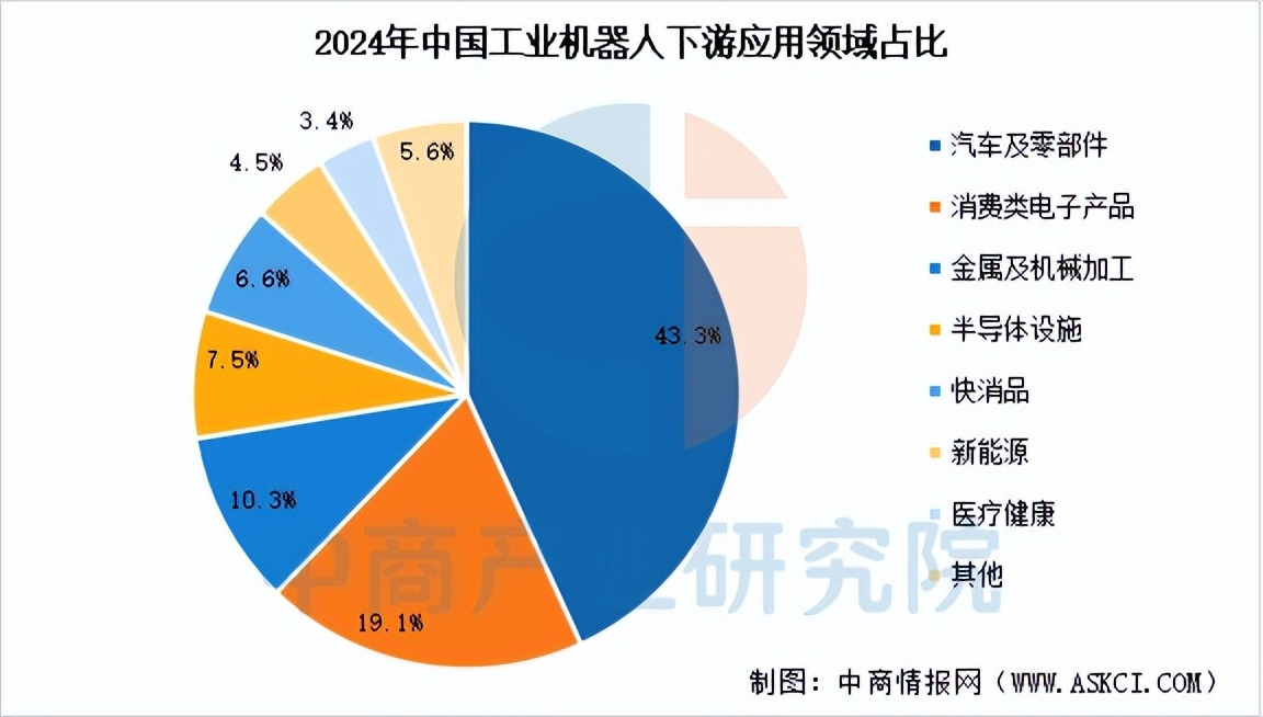 从应用领域来看,汽车制造、电子电气和金属加工是工业机器人的三大传统应用场景。中商产业研究院发布的《2025-2030全球与中国工业机器人市场现状及未来发展趋势》显示,2024年汽车及零部件为最大应用领域,占比43.3%;消费类电子产品和金属及机械加工分别占比19.1%和10.3%。