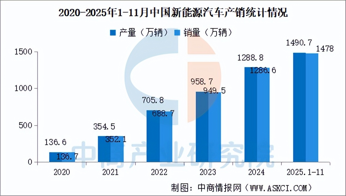 新能源汽车产业快速发展为机器人应用注入强劲动力,带动焊接、装配、搬运等环节需求。中商产业研究院发布的《2025-2030年中国新能源汽车产业调研及发展趋势前瞻报告》显示,2025年1-11月,新能源汽车产销分别完成1490.7万辆和1478.0万辆,同比分别增长31.4%和31.2%,新能源汽车新车销量达到汽车新车总销量的47.5%。