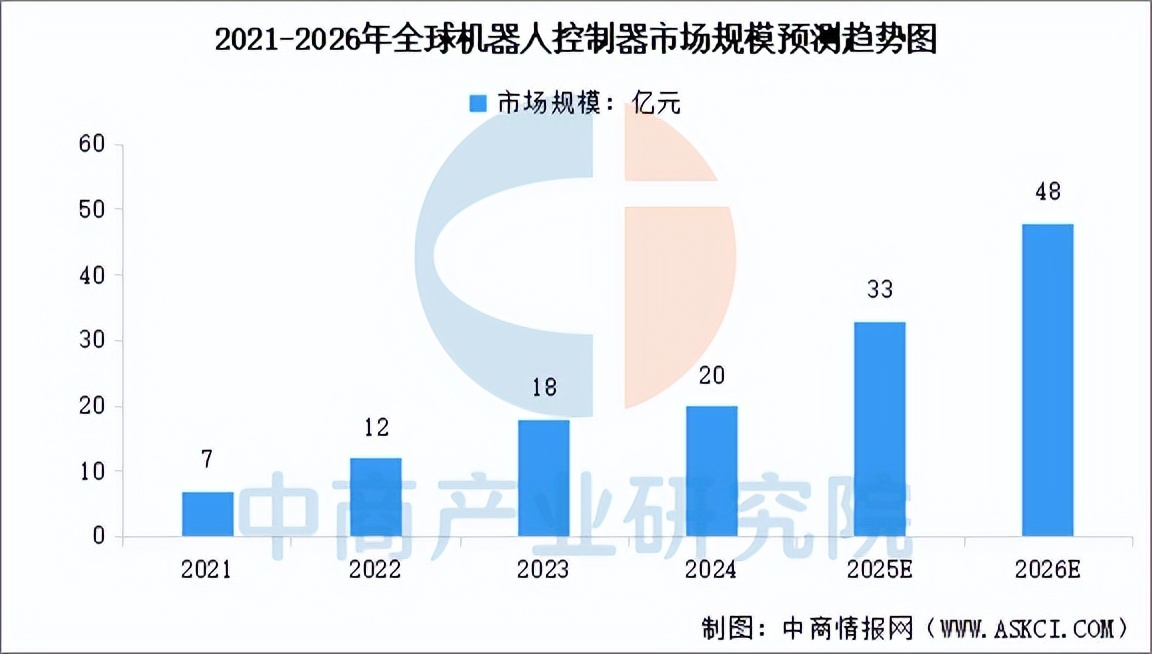 控制器作为机器人的“大脑”,其智能化水平决定机器人自主性。中商产业研究院发布的《2025-2030年中国控制器产业前景预测与战略投资机会洞察报告》显示,全球机器人控制器市场规模从2021年的7亿元增长至2024年的20亿元。中商产业研究院分析师预测,2025年全球控制器市场规模将达到33亿元,2026年市场规模将达到48亿元。