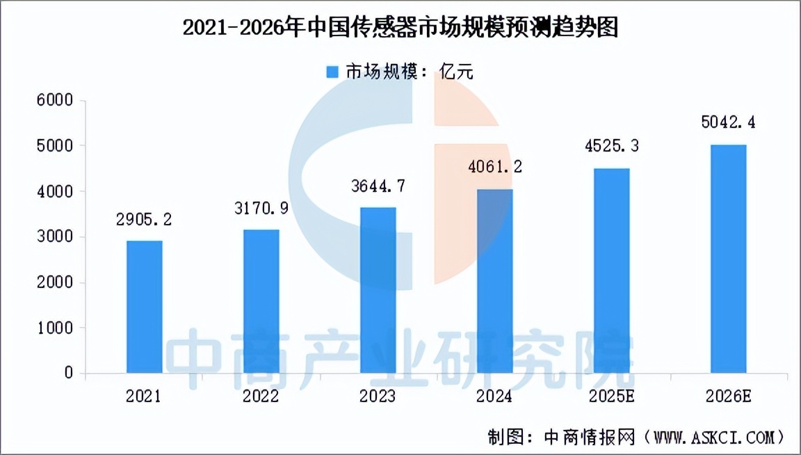 传感器是机器感知环境的"感官神经"。目前高端六维力传感器、3D视觉传感器等仍大量依赖进口,成为制约协作机器人、人形机器人等前沿领域发展的瓶颈。中商产业研究院发布的《2025-2030年中国智能传感器行业前景与市场趋势洞察专题研究报告》显示,2024年中国传感器市场规模为4061.2亿元,较上年增长11.43%。中商产业研究院分析师预测,2025年中国传感器市场规模将达到4525.3亿元,2026年市场规模将达到5042.4亿元。