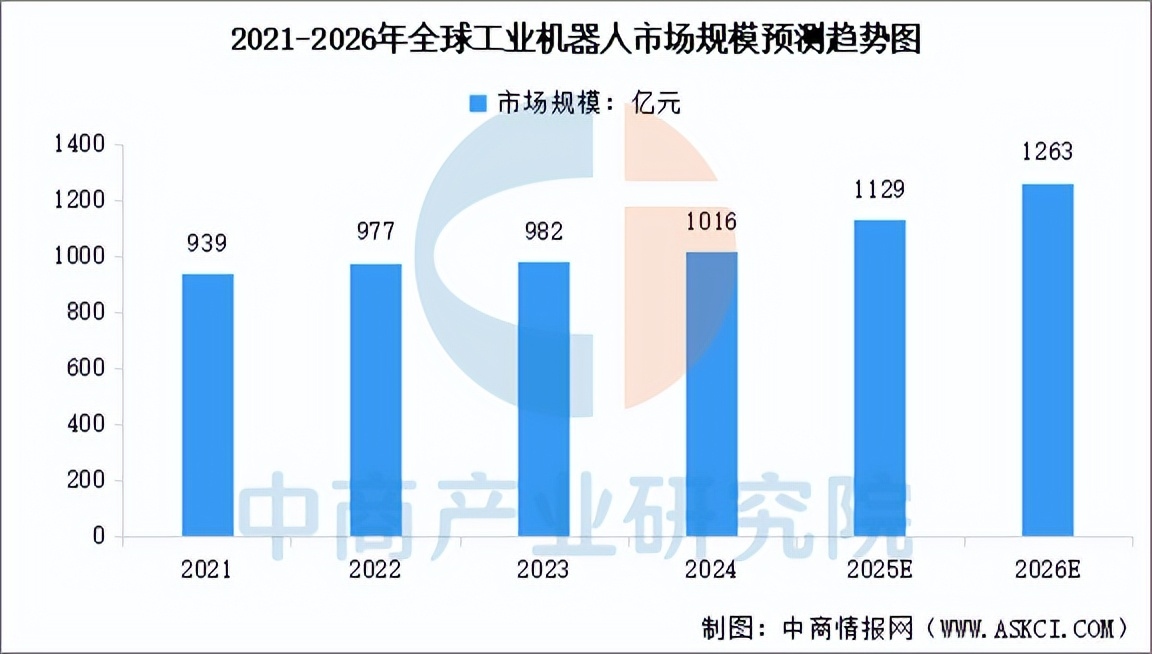 全球市场稳步扩张,亚太地区为主要增长引擎。中商产业研究院发布的《2025-2030全球与中国工业机器人市场现状及未来发展趋势》显示,2024年全球工业机器人市场规模达1016亿元,较上年增长3.5%。中商产业研究院分析师预测,2025年全球工业机器人市场规模将达到1129亿元,2026年市场规模将达到1263亿元。