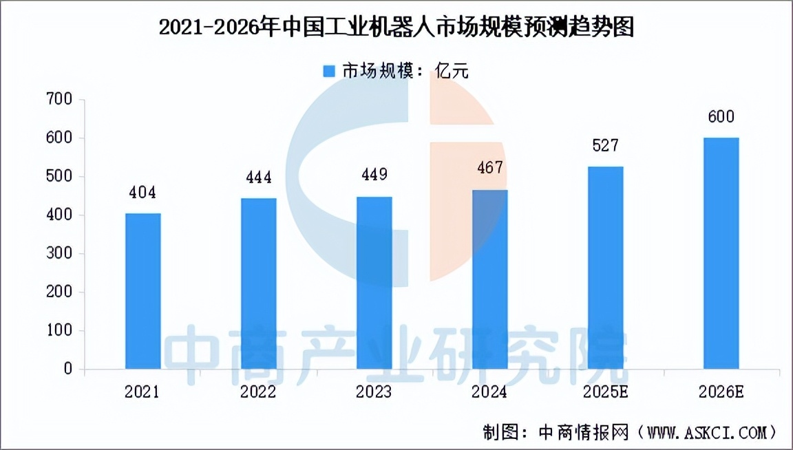 中国市场占据全球重要份额,内生增长动力强劲。中商产业研究院发布的《2025-2030全球与中国工业机器人市场现状及未来发展趋势》显示,2024年中国工业机器人市场规模达467亿元,较上年增长4.0%。中商产业研究院分析师预测,2025年中国工业机器人市场规模将达到527亿元,2026年市场规模将达到600亿元。