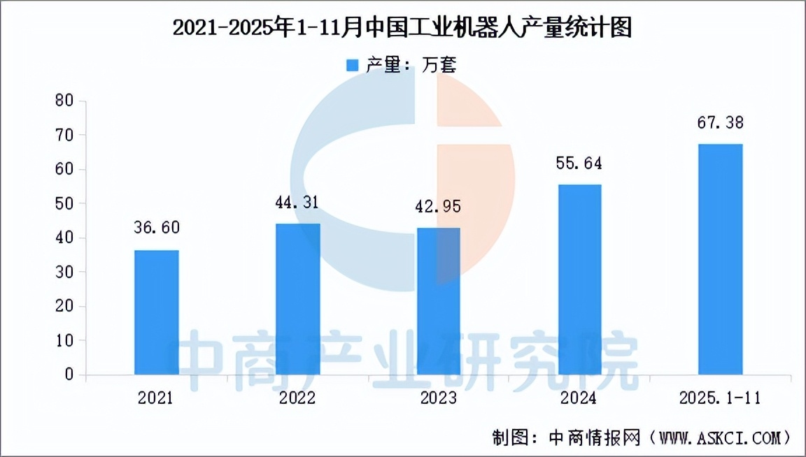 中国工业机器人产量持续高速增长,供给能力显著增强。中商产业研究院发布的《2025-2030全球与中国工业机器人市场现状及未来发展趋势》显示,2024年中国工业机器人产量55.64万套,较上年增长29.53%。2025年1-11月,中国工业机器人产量已达到67.38万套。