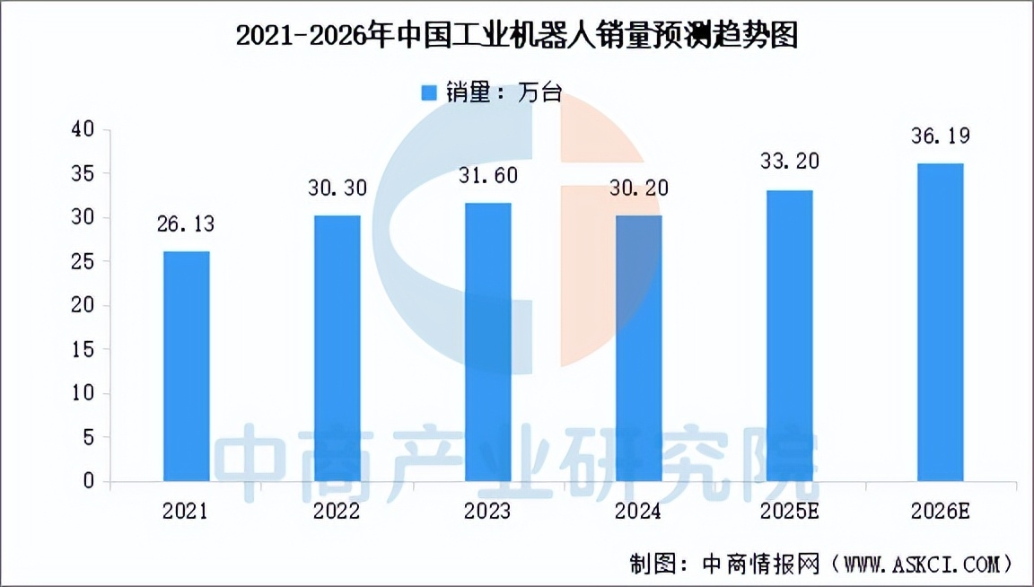 国内市场销量短期调整,但中长期复苏与增长趋势明确。中商产业研究院发布的《2025-2030全球与中国工业机器人市场现状及未来发展趋势》显示,2024年中国工业机器人销量为30.2万台,同比下降4.50%。中商产业研究院分析师预测,2025年中国工业机器人销量将达到33.20万台,2026年销量将达到36.19万台。