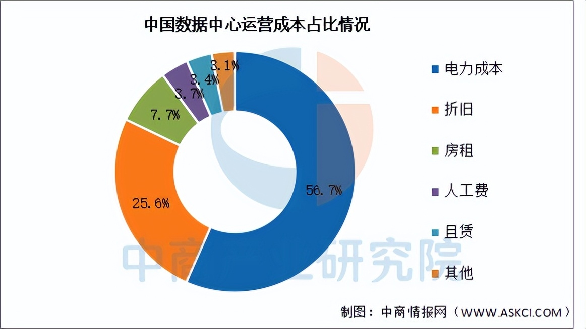 我国数据中心运营成本中,电力成本、折旧和房租占据前三位,占比依次为56.7%、25.6%和7.7%;人工费和设备租赁占比分别为3.7%、3.4%。
