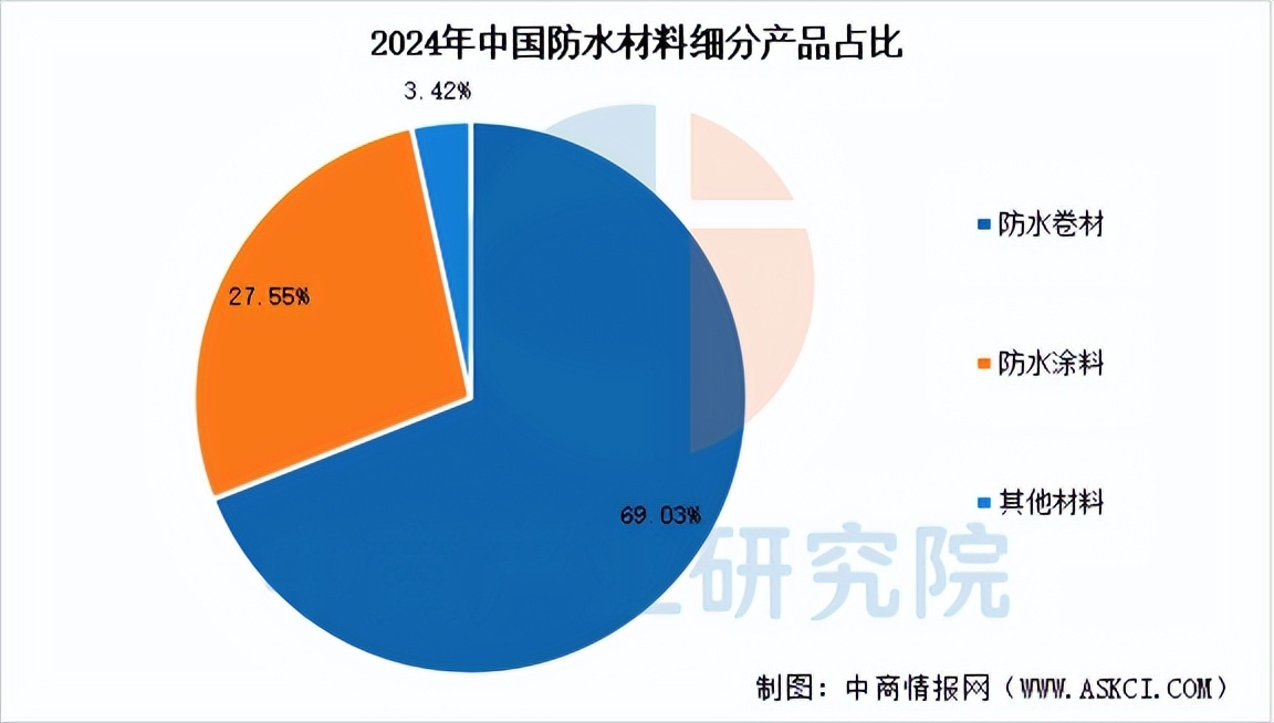中商产业研究院发布的《2025-2030年中国防水材料行业深度研究及发展前景投资预测分析报告》显示,中国防水材料市场呈现“卷材为主、涂料为辅”的产品结构。其中,防水卷材是绝对主导,市场份额约占69.03%,SBS/APP改性沥青卷材为核心;防水涂料位居第二,占比约27.55%,在家庭装修等领域应用广泛。整体而言,行业正持续从传统沥青产品向性能更优、更环保的高分子卷材和环保型涂料演进。
