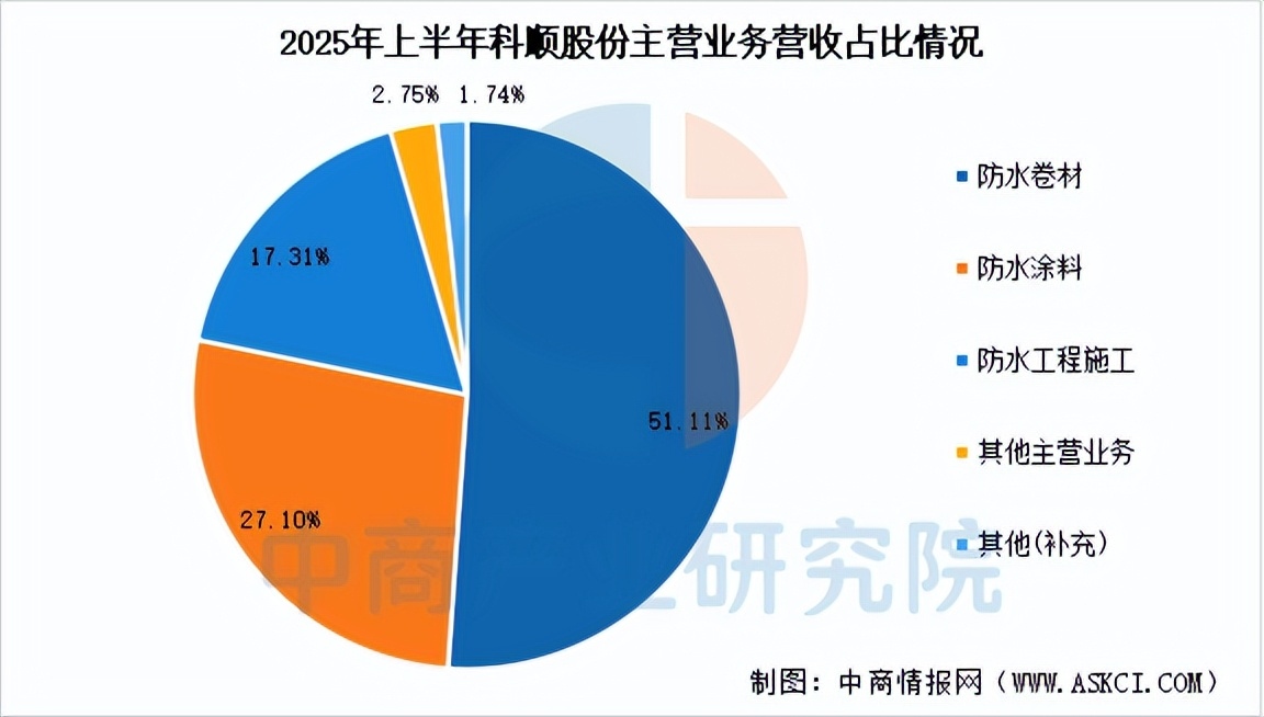 科顺股份成立于1996年,是一家以提供建筑防水综合解决方案为主业,产品和服务涉及工程防水、民用建材、建筑修缮、减隔震、建筑砂粉、光伏能源等多个业务板块的建材系统服务商。2025年前三季度,科顺股份实现营业收入47.03亿元,同比下降8.43%,归母净利润2008.77万,同比下降84.08%。2025年上半年,公司防水卷材收入16.46亿元,占比51.11%,防水涂料收入8.726亿元,占比27.10%。
