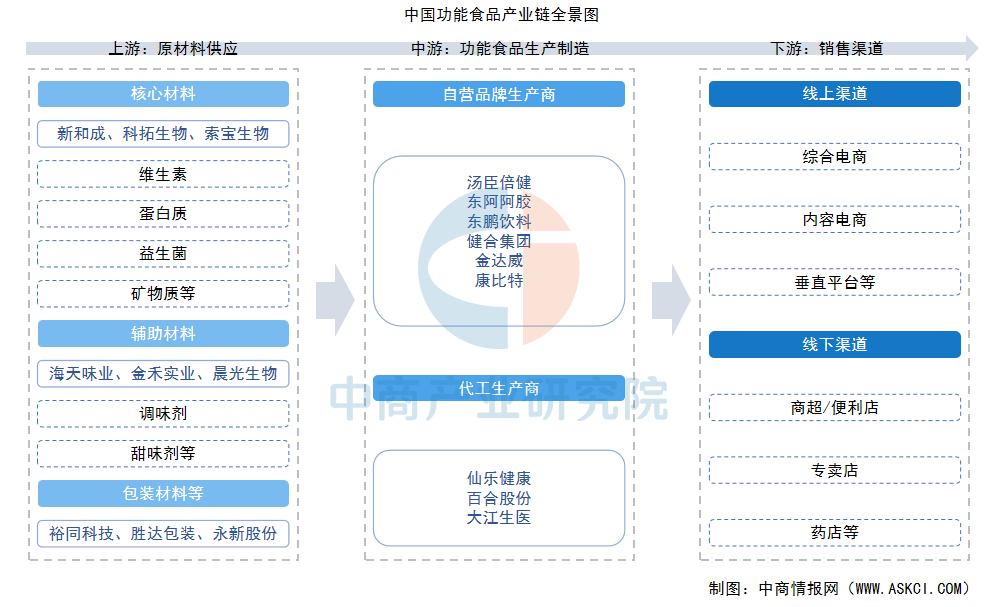 功能食品产业链涵盖上游原材料供应、中游生产制造及下游销售渠道三大环节。上游原材料供应包括三大类别:一是核心成分,如维生素、蛋白质、益生菌、矿物质等;二是辅助成分,如调味剂、甜味剂等功能性添加剂;三是包装材料,如标签、包装袋等。中游生产制造分为两类企业:代工生产商(提供OEM/ODM/CDMO服务)与自营品牌生产商(自主研发、生产并运营自有品牌)。下游为销售渠道,包括线上电商平台、线下商超、药店等。