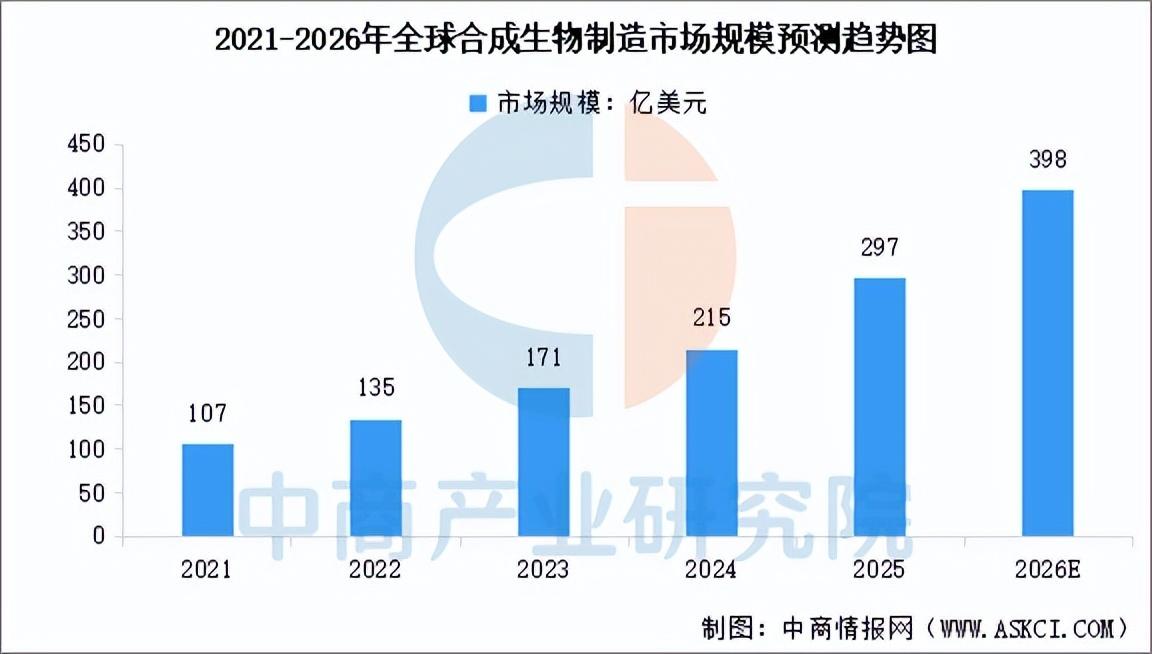 在技术突破与产业化加速的双重驱动下,全球合成生物制造市场规模持续扩大。中商产业研究院发布的《2025-2030年中国合成生物行业前景预测与投资战略规划分析报告》显示,2024年全球合成生物制造市场规模达到215亿美元,同比增长25.7%,2025年市场规模约为297亿美元。中商产业研究院分析师预测,2026年全球合成生物制造市场规模将达到398亿美元。