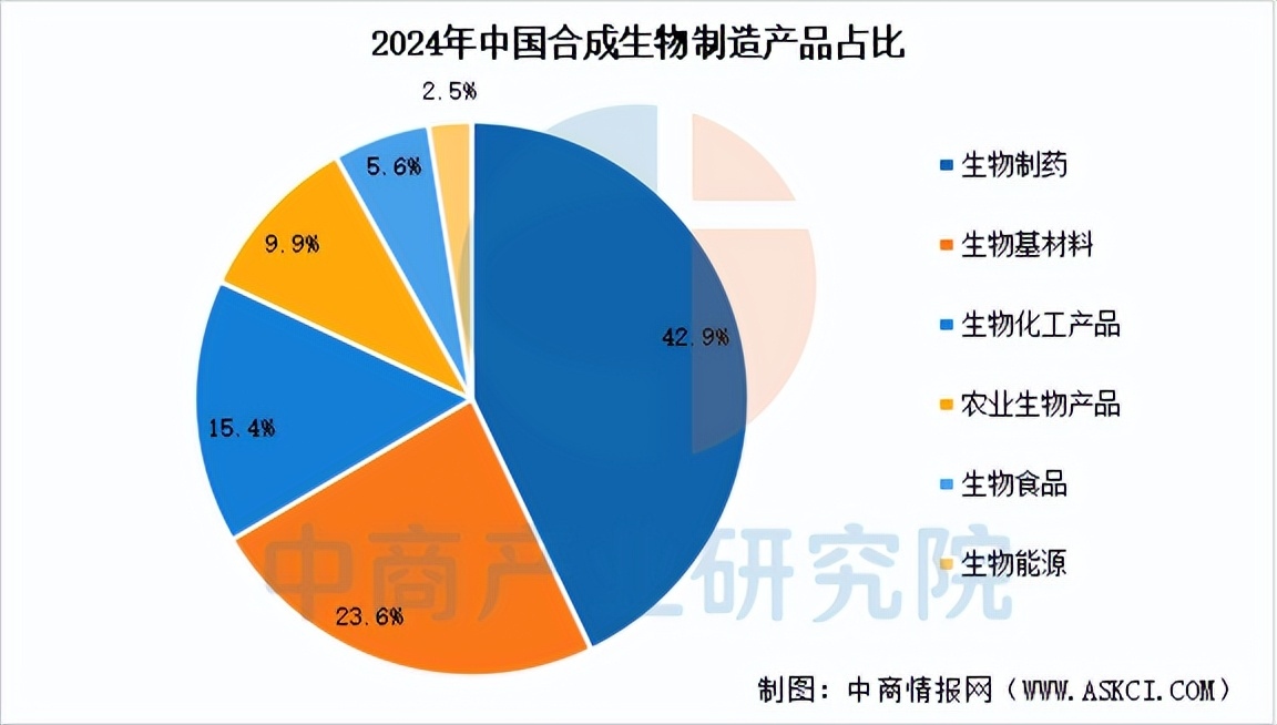中商产业研究院发布的《2025-2030年中国合成生物行业前景预测与投资战略规划分析报告》显示,合成生物制造产品结构中,生物制药占比最高,达42.9%,占据近半市场份额;生物基材料(23.6%)与生物化工产品(15.4%)合计占比近40%,显示出替代传统化工材料的加速趋势;此外,农业生物产品(9.9%)、生物食品(5.6%)和生物能源(2.5%)也构成重要组成部分。