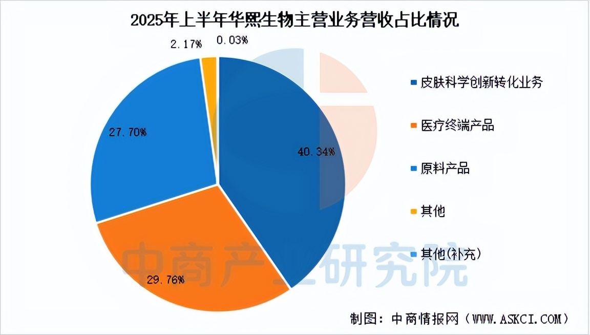 2025年前三季度,华熙生物营业收入为31.63亿元,同比下降18.36%,归母净利润为2.52亿元,同比下降30.29%。分产品来看,2025年上半年,公司皮肤科学创新转化业务收入占比40.34%,医疗终端产品收入占比29.76%,原料产品收入占比27.70%。