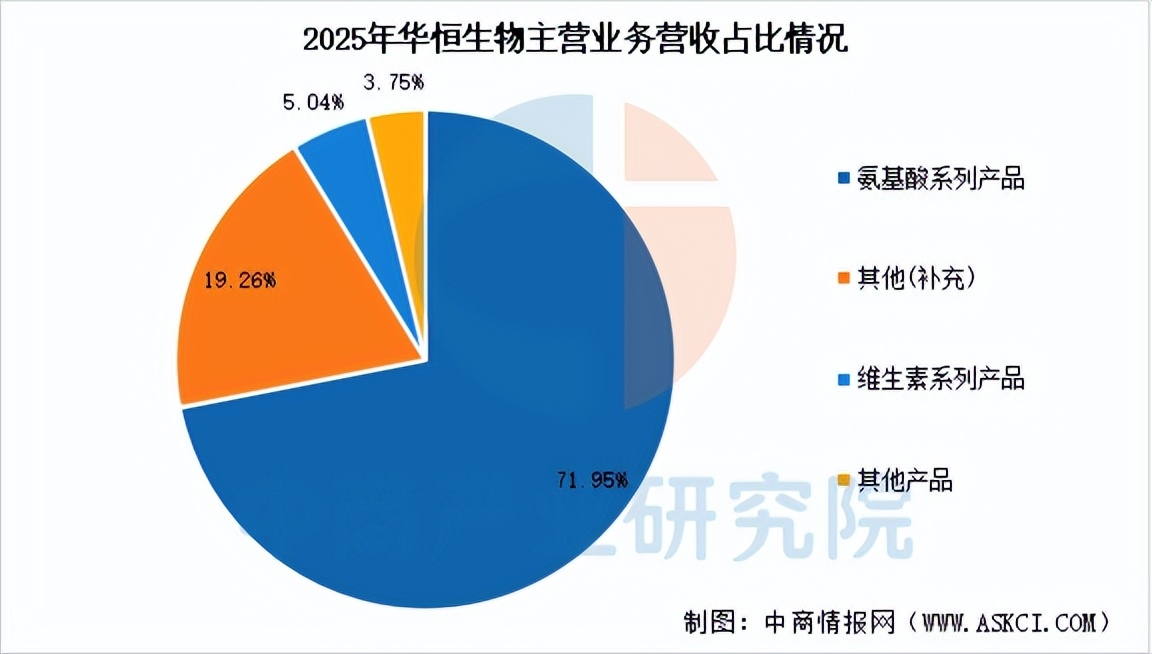 2025年,华恒生物实现营业总收入28.62亿元,同比增长31.40%,归母净利润1.32亿,同比下降30.13%。分产品来看,2025年,公司氨基酸系列产品收入占比71.95%,维生素系列产品收入占比5.04%。