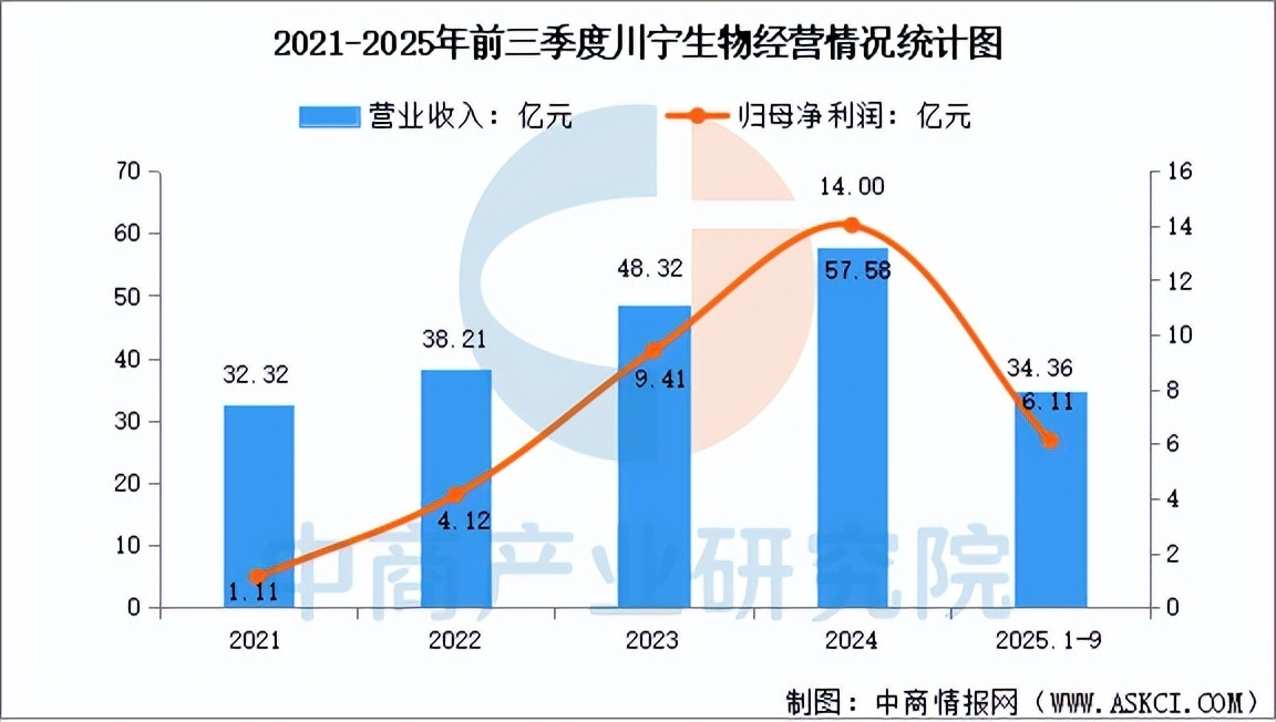 2025年前三季度,川宁生物营业收入为34.36亿元,同比下降22.90%,归母净利润为6.11亿元,同比下降43.17%。分产品来看,2025年上半年,公司医药中间体收入占比91.86%。