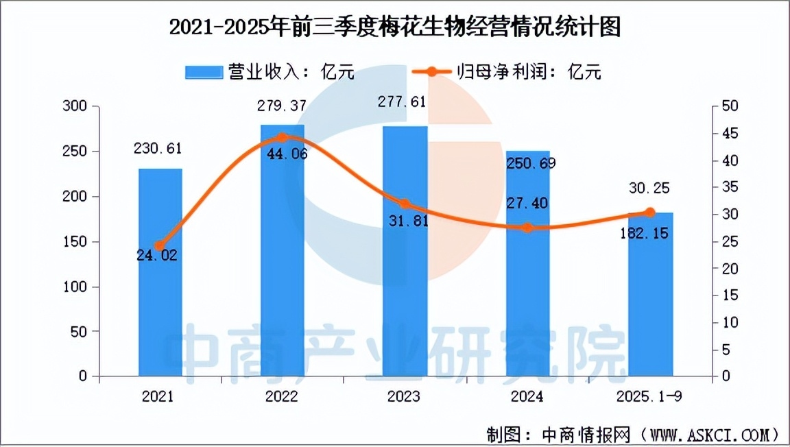 2025年前三季度,梅花生物营业收入为182.15亿元,同比下降2.49%,归母净利润为30.25亿元,同比增长51.61%。分产品来看,公司饲料氨基酸收入占比44.97%,鲜味剂收入占比29.27%,大原料副产品收入占比15.97%,医药氨基酸收入占比2.58%。
