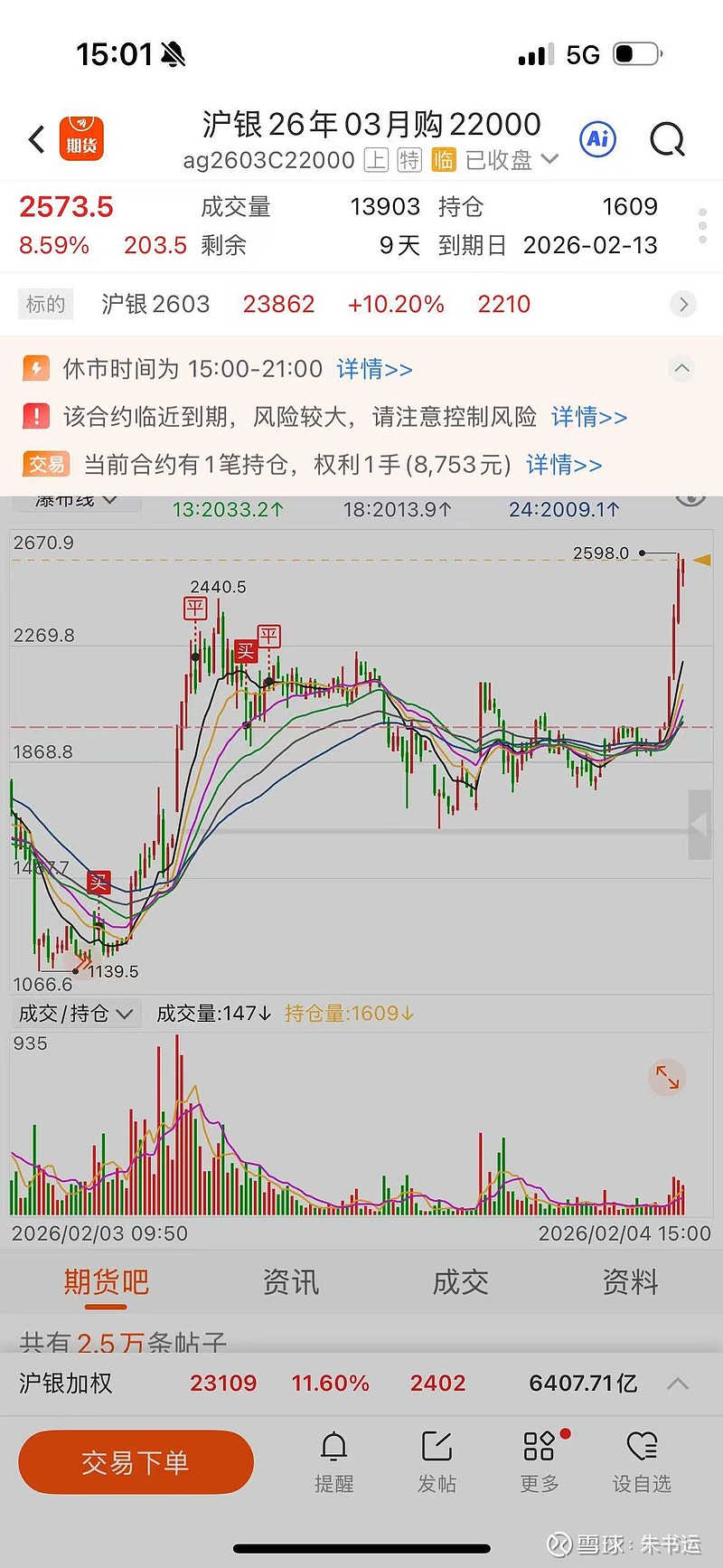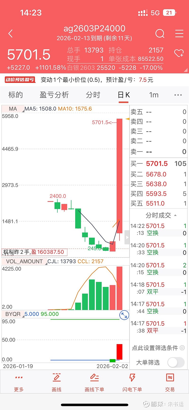 2.1号的帖子里我已经明确了白银这波下跌幅度和反弹幅度以及未来具体演绎,除了切换为卖方模式外,我也开了些看涨期权,都是平直或者实值的买call,白银买的是call22000,黄金也买call了遗憾的是黄金没拿住,黄金拿住也翻倍了。逻辑很简单就是吃这波反弹,因为不确定什么时候开始反弹,所以卖put是主要仓位,买call只是辅助仓位。