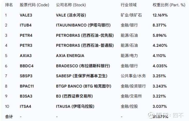 极高的集中度: 前十大权重股合计占比超过 51.5%。这意味着买入巴西 ETF 实际上就是买入了巴西最核心的 10 家巨头。