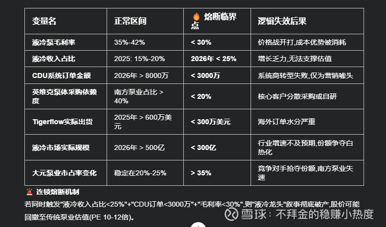 [反向证伪变量] 🔥 价值量虚高风险: 循环泵是标准化工业品,技术门槛远低于CDU中的板换、控制系统;若下游英维克等系统集成商自研泵体或绑定格兰富等国际品牌,南方泵业"核心零部件"叙事将破产。关键监控指标: 英维克/曙光等CDU厂商泵体自给率是否提升。