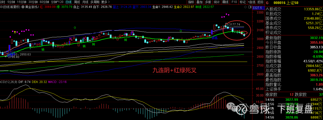 为什么考虑到这点,因为上证50指数已经九连阴,且日级别红绿死叉。不是说要大家多关注、参与它,而是这种连续阴线造成的趋势向下翻转,短期会有确认。